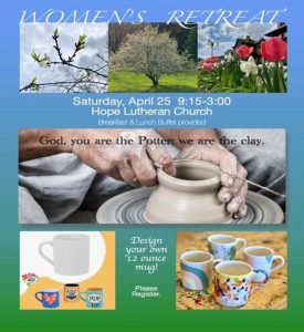 “God, you are the Potter, we are the Clay” Saturday April 25 at Hope. Time: 9:15 to 3pm Breakfast and Lunch provided. You will be invited to decorate a mug to take home or to donate. We are gathering men’s and women’s gently used or new clothing donations for Beaver County Trails, a faith based ministry supporting reentry into society of incarcerated individuals. (hoodies, sweatshirts, sweatpants, cargo pants, T-shirts, socks, jackets, coats, hats and gloves). Please sign up today!!